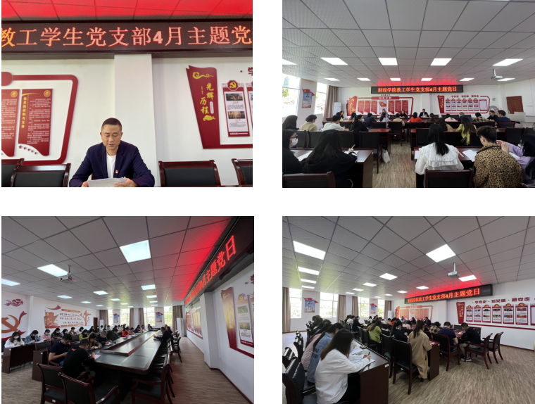 2022年4月13日,财经学院教工学生党支部在第二教学楼303党员阵地室开展了4月主题党日,主题是:学习中共中央办公厅印发《关于推动党史学习教育常态化长效化的意见》、《教育部思想政治工作司2022年工作要点》、宣讲红色故事。主题党日由总支书记艾海涛主持,全体党员同志参加。