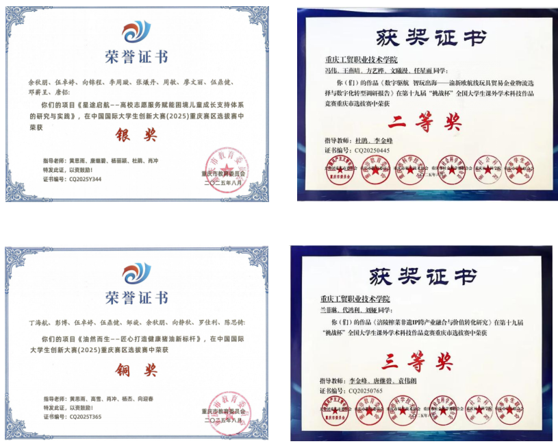 近期,在第十九届 “挑战杯” 全国大学生课外学术科技作品竞赛重庆市选拔赛、中国国际大学生创新大赛(2025)重庆赛区选拔赛两大赛事中,财经学院师生凭借 “财经 + 行业” 的深度融合实践,斩获市级 3 个一等奖、3 个二等奖、2 个三等奖的亮眼成绩,充分展现学院将财经专业能力转化为多领域创新动能的扎实成效。